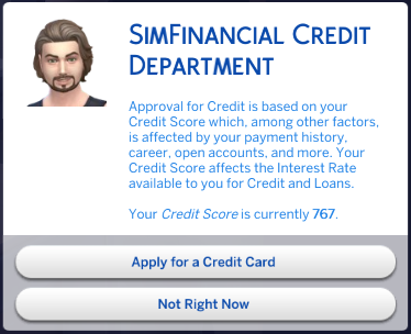 Every Sims is assigned a credit score. The Credit Score is based upon factors such as income, career levels, marital status, open accounts, if bills are paid, late payments, defaulted or charged off accounts, on time payments, cash, property values, and more. Your Credit Score is not static. If your Sims lose their job or opens a new account or fails to make a payment a the credit score is affected. Every time they apply for a new credit card, loan, or insurance, the credit score is run and it can vary.