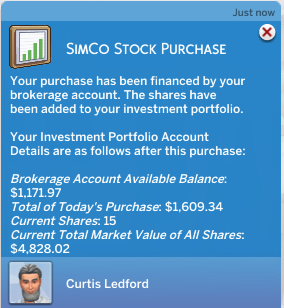 Sims can now invest in the fickle stock market. Open a Brokerage Account and start buying and selling shares of SimCo stock. The current market value of the shares changes based on current market conditions at the time of the sale or purchase. While they do not fluctuate daily, market conditions shift over time and what you value of your shares can remain stable, go down, or go up. Keep an eye on the markets for the best time to sell and make a profit! Funds from your Brokerage Account can be transferred to your Checking Account or Household funds. But in order to buy or sell shares your Brokerage Account must be funded.