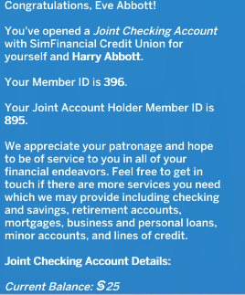 Your sims will need to open a Joint or Personal Checking with SimFinancial Credit Union in order to access savings accounts, retirement accounts, insurance, credit cards, or investment options through the Credit Union. Opening an Account requires a 25 dollar deposit. Sims can choose to have automated transfers from other accounts to their checking accounts and from their daily paychecks into their checking accounts.