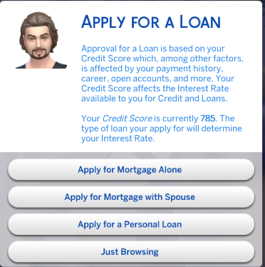 Can be opened by all adult Sims. They can be applied for separately or with a spouse. The credit score of both spouses will determine the loan terms.