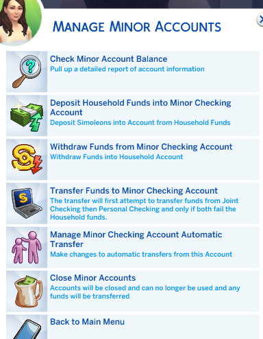 Once your sim open an account, they are also able to open Minor Checking and Savings Accounts for their children, infant and up. Both parents have access to minor accounts. They can setup automatic deposits from the household funds to their children's savings accounts. They can also setup automatic deposits into the Minor Checking account as a weekly allowance. When Teens age up their Minor Accounts are transferred into Personal Checking and Savings accounts.