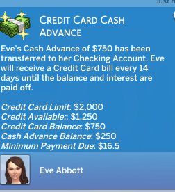 Being able to access the mod via the Sim is helpful in case your phone has been shut off or broken (see Unexpected Expenses) and you need a quick credit card cash advance or a loan to get it back up a running.