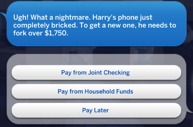 You can choose to pay at the time you're notified of the issue to make it go away, pay later via the phone under the Household menu, or if your phone is unavailable due to the financial event (i.e. lost power or broken phone), by clicking on your Sim.