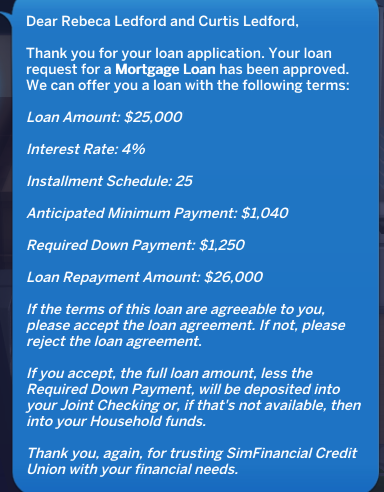 You can choose your desired loan amount and a loan officer will inform you if your loan has been denied or approved and the terms under which it is approved such as interest rate, minimum payment, and installments. For mortgages, your sim's are required to make a downpayment. You can reject the loan terms or accept them. The funds will be distributed into your sim's checking accounts.