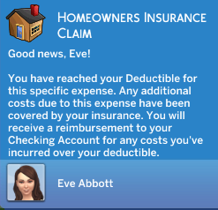 For property insurance (Auto, Homeowners, Rental) when your sim has an expense covered under their policy, they will be notified if insurance has covered a portion of their cost. So if a sink breaks and the sim wishes to repair or replace that sink, if the cost to do so is more than their deductible than insurance will cover the rest and the sim will only need to pay for the portion not met by the deductible. The deductible does not accumulate. Each covered expenses is calculated individually to see if it meets the deductible. For instance if you repair 7 sinks they are seen as 7 separate expenses incurred and 7 separate times your sim would need to meet their deductible before insurance kicked in.